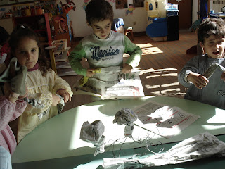 Utilizámos materiais recicláveis, tais como, jornais, restos de arame, tubos de borracha e rolhas.