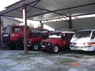 No exterior observámos os carros destinados ao combate aos incêndios. Existem veículos próprios para o combate a incêndios em meio rural e urbano.