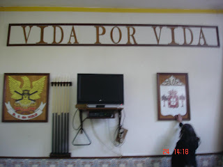 Demos entrada pelo Bar onde se encontra o lema de todos os Bombeiros, "VIDA POR VIDA" ladeado pelo seu emblema e pelo brasão da aldeia de Melo.