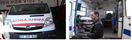Observámos as várias ambulâncias que se encontravam no edifício e que se destinam ao socorro em caso de acidente e ao transporte de doentes.